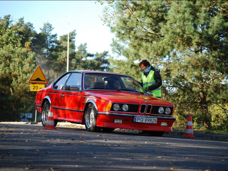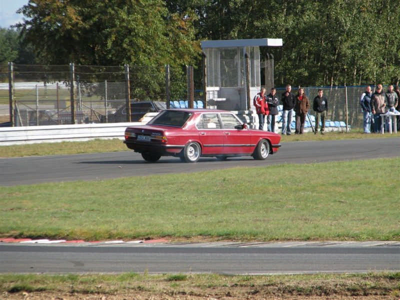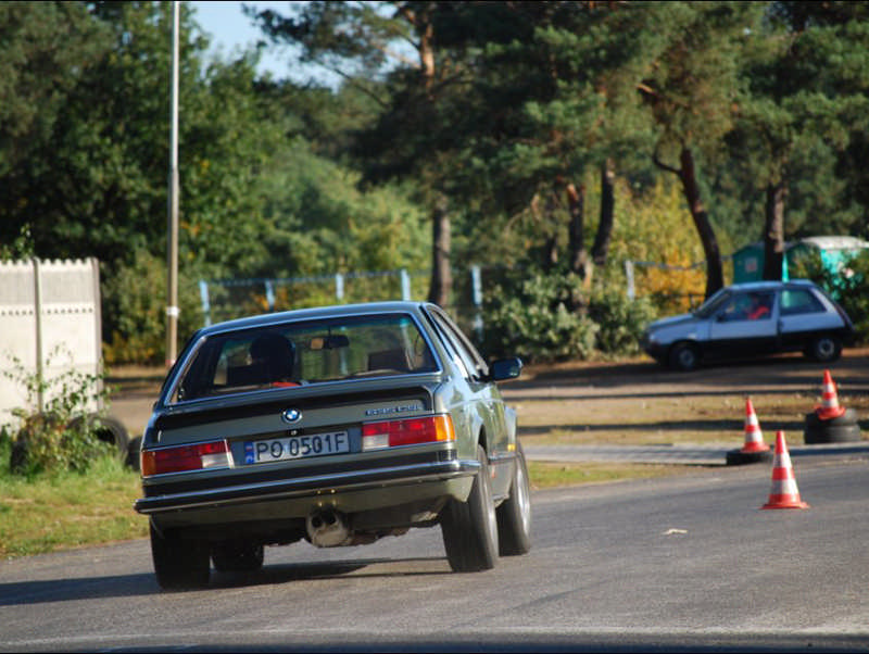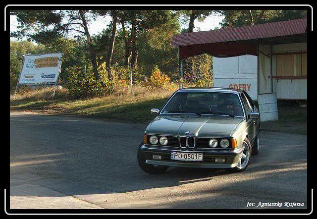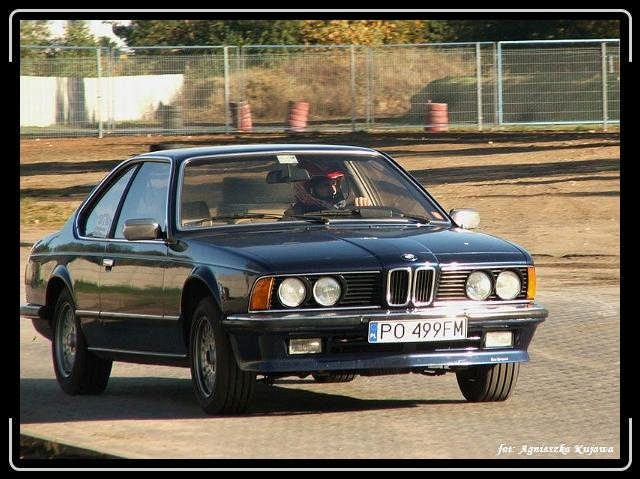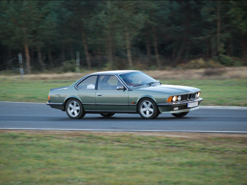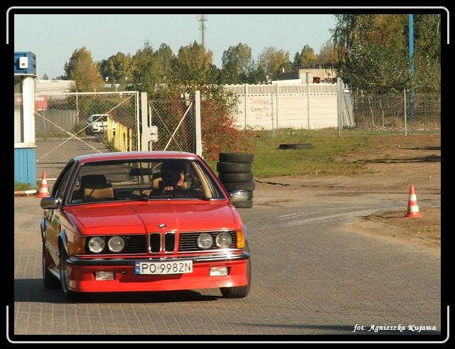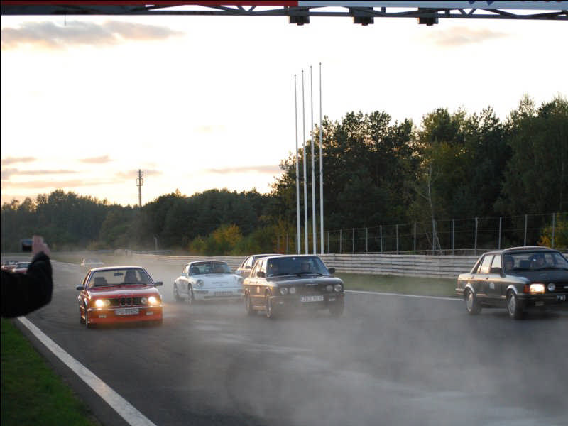 Następna klasą było powyżej 150KM wiec wszyscy zaczęliśmy się powoli szykować do przejażdżki bo nasz kolega z 524TD troszkę zabrudził tor.Przejechaliśmy próbne okrążenie. Ustawiliśmy się, Dawid z porszakiem coś nie tak zrobili i dostali karę tj. cofnięci na koniec stawki. Jakto Wojtek powiedział: ’ to chyba jest kara dla mnie '. Ja przerażony, że Dawid będzie mi siedział na ogonie, ogarniam się, flaga do góry istart! I zanim zdążyłem wdusić pedał gazu w podłogę Dawid już był parę metrów przede mną, kamień spadł mi z serca. Jechaliśmy z Wojtkiemspokojnie i zachowawczo tak żeby nie było ’ krajobrazu ', jednak i tak w czerwonej 635CSI tarcze rozgrzały się do czerwoności. Dawid z Miłoszemzrobili tylko jedno okrążenie. Dawid i Porsche startowali z tylu, wiec uciekł im na początku Helmut i jechał miedzy nimi, przez chwile jaknie mogli wyprzedzić Helmuta to porsche trochę odeszło, jak walnęli Helmuta to później na trzech zakrętach troszkę zbliżyli się do porsche,ale do siedzenia sobie na zderzaku było jeszcze bardzo daleko, już przed ostatnim zakrętem wysiadł czujnik i drugiego okrążenia już nie jechali…