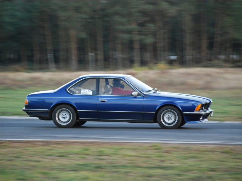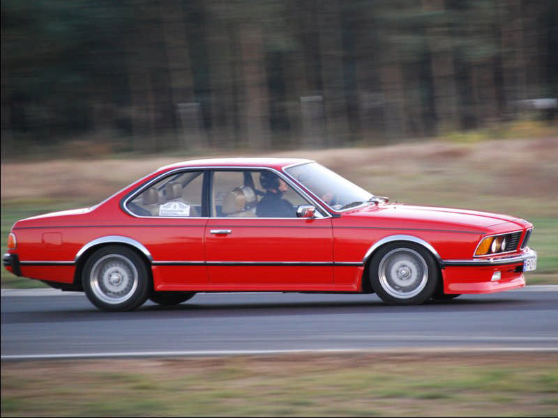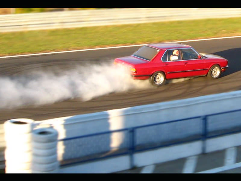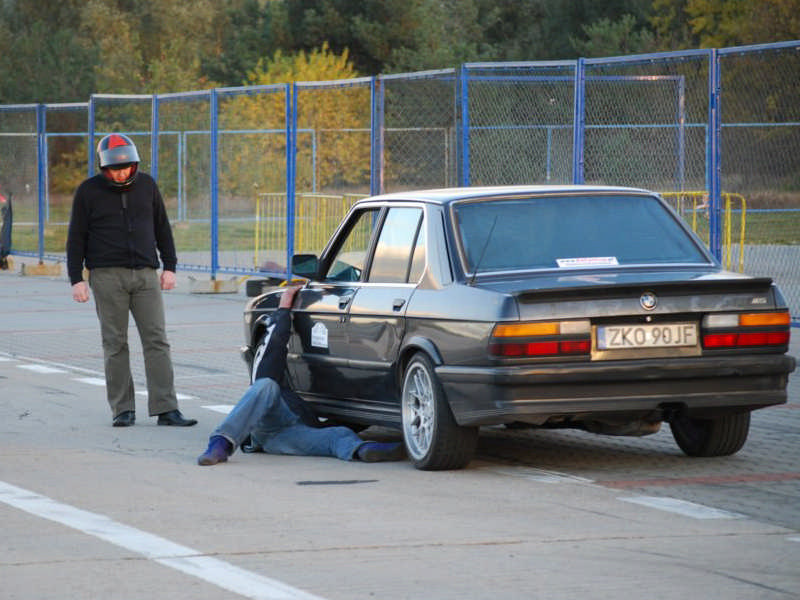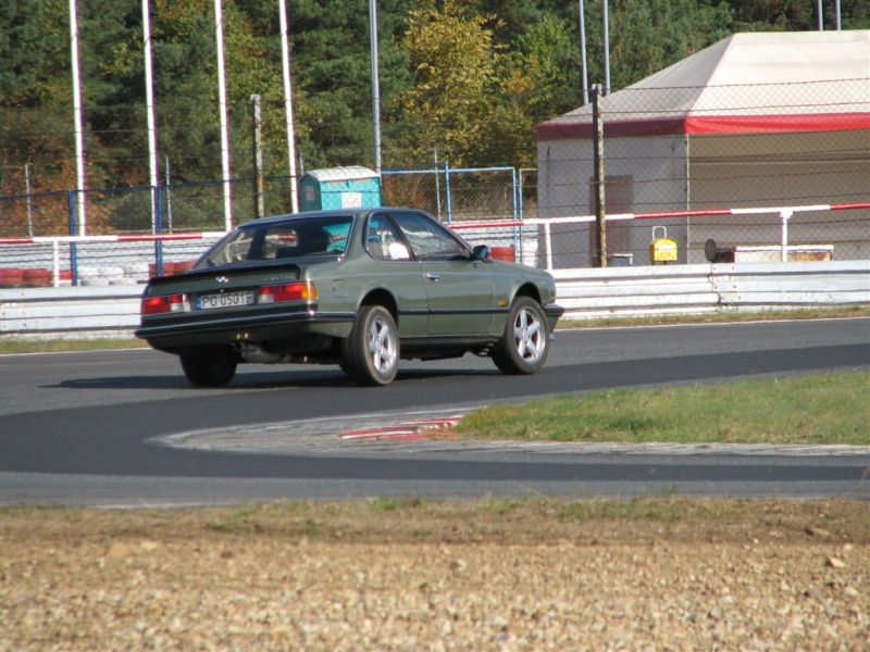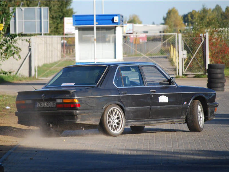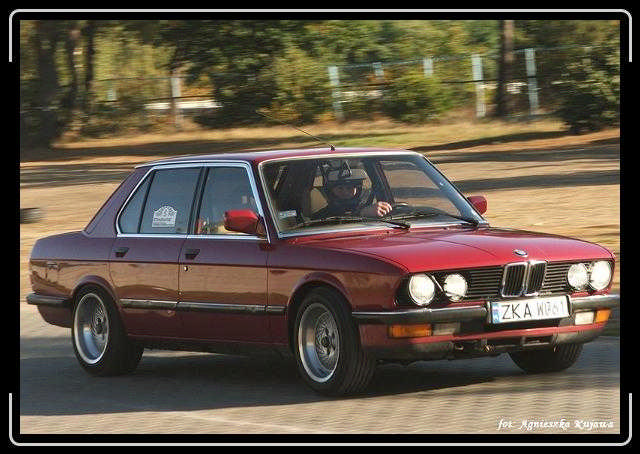 Następna klasą było powyżej 150KM wiec wszyscy zaczęliśmy się powoli szykować do przejażdżki bo nasz kolega z 524TD troszkę zabrudził tor.Przejechaliśmy próbne okrążenie. Ustawiliśmy się, Dawid z porszakiem coś nie tak zrobili i dostali karę tj. cofnięci na koniec stawki. Jakto Wojtek powiedział: ’ to chyba jest kara dla mnie '. Ja przerażony, że Dawid będzie mi siedział na ogonie, ogarniam się, flaga do góry istart! I zanim zdążyłem wdusić pedał gazu w podłogę Dawid już był parę metrów przede mną, kamień spadł mi z serca. Jechaliśmy z Wojtkiemspokojnie i zachowawczo tak żeby nie było ’ krajobrazu ', jednak i tak w czerwonej 635CSI tarcze rozgrzały się do czerwoności. Dawid z Miłoszemzrobili tylko jedno okrążenie. Dawid i Porsche startowali z tylu, wiec uciekł im na początku Helmut i jechał miedzy nimi, przez chwile jaknie mogli wyprzedzić Helmuta to porsche trochę odeszło, jak walnęli Helmuta to później na trzech zakrętach troszkę zbliżyli się do porsche,ale do siedzenia sobie na zderzaku było jeszcze bardzo daleko, już przed ostatnim zakrętem wysiadł czujnik i drugiego okrążenia już nie jechali…
